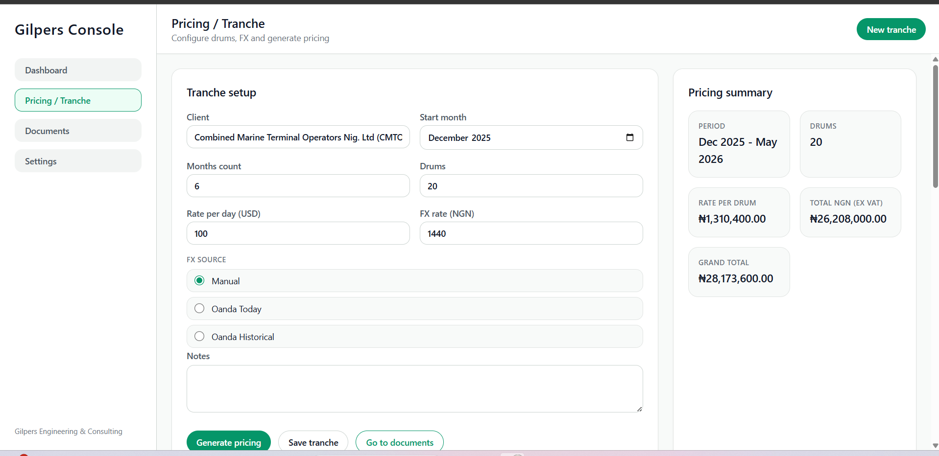 • Developed a full-stack internal tooling application using React and Python (FastAPI) backed by AWS DynamoDB and S3, to automate tranche-based pricing logic and reduce manual data entry by generating instant quotation, delivery, and invoice documents via a custom RESTful API.